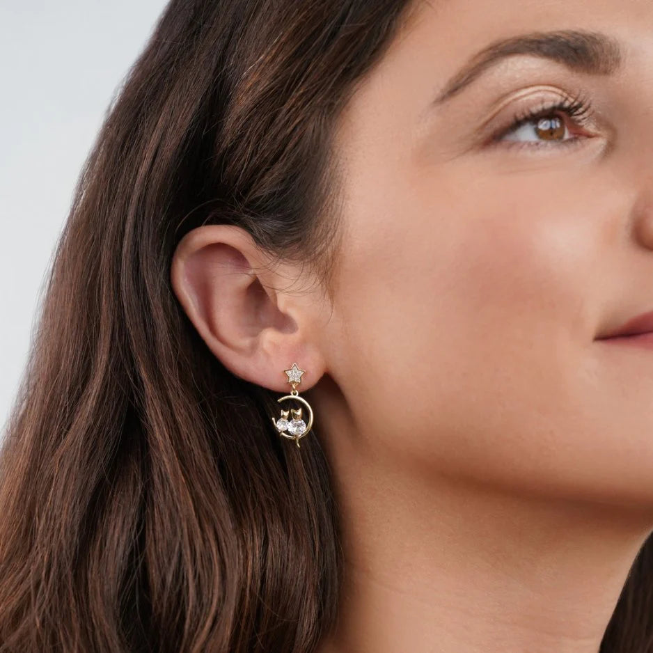 ✨ Estos pendientes, con delicados motivos de gato y luna, capturan la belleza celestial de la media luna dorada que sostiene piedras preciosas brillantes , con una estrella adornada con gemas más pequeñas colgando encima. El intrincado diseño agrega elegancia y magia a tu look.