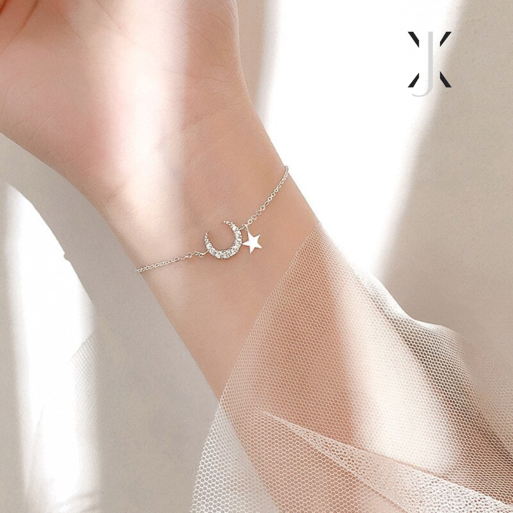 Elevate your style with our Moon & Star Bracelet. This celestial-inspired piece embodies the timeless beauty of the night sky, capturing the magic of the moon and stars in a stunningly crafted accessory. The delicate crescent moon charm features shimmering crystals or intricate engraving, while petite star charms add an extra layer of celestial sparkle. Crafted for durability and comfort, our bracelet features a secure lobster clasp closure and adjustable chain for the perfect fit.